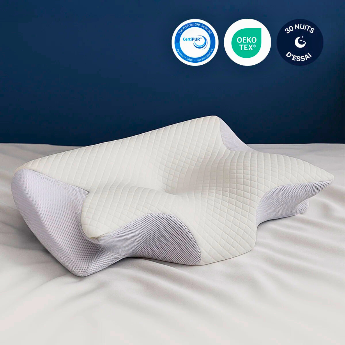 Soulagez vos douleurs cervicales avec notre oreiller ergonomique cervical à mémoire de forme qui soutient parfaitement votre nuque, vous offrant un sommeil réparateur. Élu meilleur oreiller cervical par des centaines d'utilisateurs.